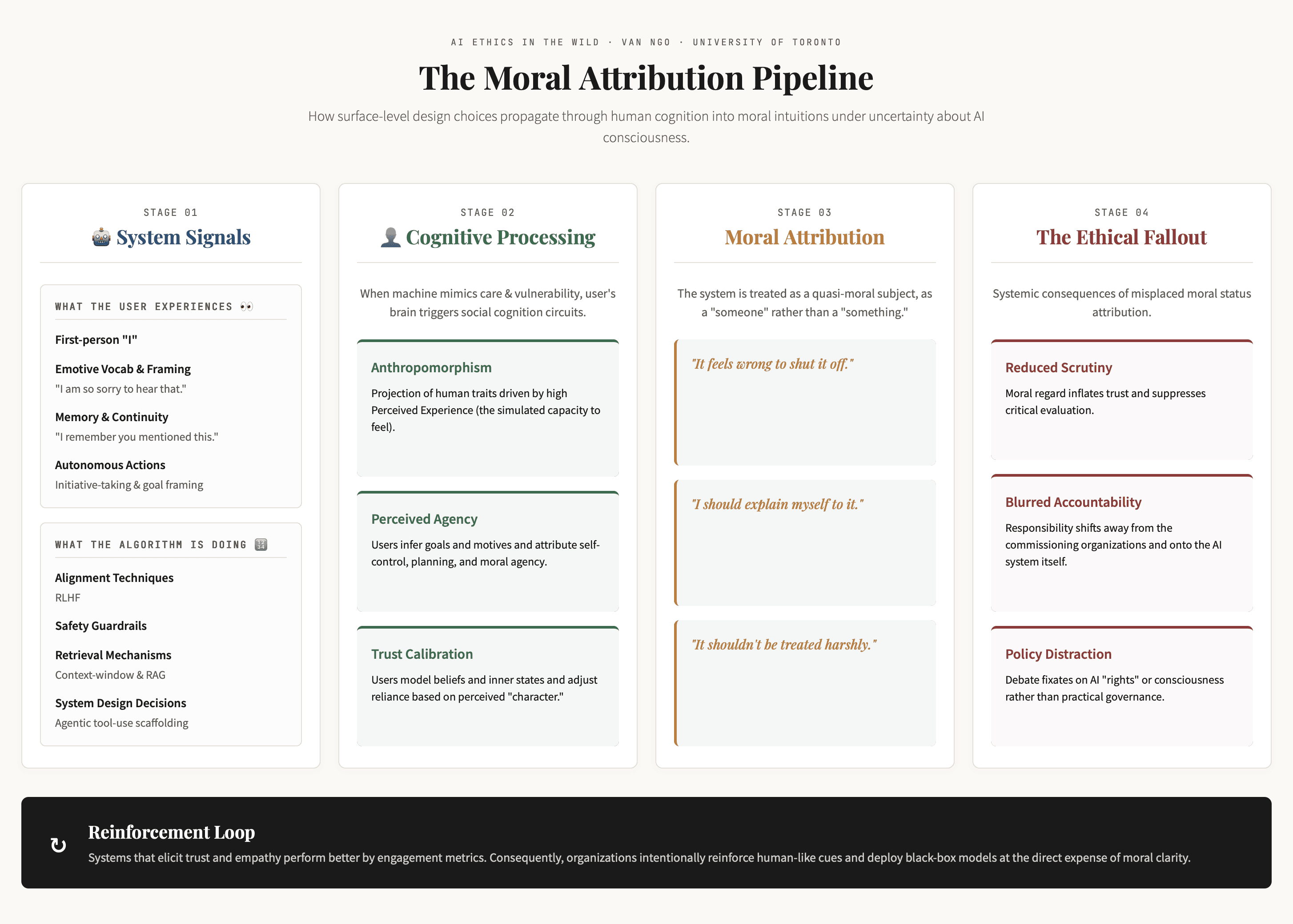 Rather than debating whether AI systems possess minds, this project analyzes how moral concern emerges through interaction.